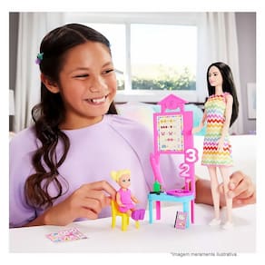 Você pode ser uma professora com o conjunto de professores da Barbie! Este conjunto inclui Barbie e seu adorável estudante de boneca de criança com peças de jogo com tema de carreira! Com o acessório do conselho de ensino, a Barbie pode ensinar seu aluno com o conjunto de adesivos inspirados no ensino.