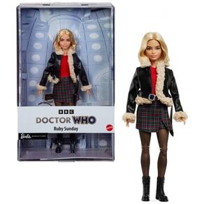 A Barbie Ruby Sunday celebra a melhor amiga do Doutor na 14ª temporada de Doctor Who, com visual inspirado diretamente na personagem da série. A boneca traz escultura de rosto única moldada à semelhança da atriz Millie Gibson. Ela usa look característico composto por camiseta vermelha, saia xadrez e jaqueta com cinto e detalhe de pelo na barra. ? O visual é completado por meia-calça preta e botas pretas, em estilo pronto para aventura. Acompanha base para boneca e Certificado de Autenticidade, sendo indicada para colecionadores e fãs a partir de 6 anos.