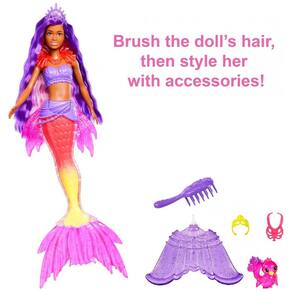 Mergulhe em aventuras de contar histórias com a boneca Barbie Brooklyn Roberts inspirada no Barbie Mermaid Power A boneca Barbie apresenta um visual mágico de sereia, completo com cabelo roxo extra longo e uma linda cauda ombre com toques premium e escamas esculpidas. Com barbatanas intercambiáveis, 2 tiaras incrustadas de joias, 2 colares e uma escova de cabelo, as crianças podem mudar o visual da boneca Barbie para qualquer aventura. Uma adorável fênix de estimação inspira histórias fantásticas de amizade Com as bonecas Barbie Mermaid Power, crianças de 3 anos ou mais podem criar seus momentos favoritos ou inventar suas próprias histórias Marca: Não Informado