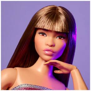 A boneca Barbie Looks 24 colecionador Mattel integra a linha Barbie Looks com inspiração em moda Y2K e passarela, em paleta de tons pastéis e acabamento brilhante. O modelo apresenta cabelo castanho longo com franja reta, sobrancelhas definidas e maquiagem de efeito luminoso adequada a composições de festa e exposição. O traje é composto por vestido rosa brilhante tomara que caia, com parte superior ajustada e saia levemente evasê, combinado a sandálias de salto alto peep toe em tom coordenado.
