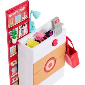 - O conjunto Barbie apresenta uma boneca Skipper com um suporte de caixa da marca Target com uma correia transportadora funcional!