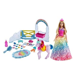 Boneca Barbie Unicórnio Arco Íris Colorido 28cm Mattel GTG01 - Este conjunto de brinquedos Barbie Dreamtopia inspira as crianças a criar todos os tipos de aventuras de contos de fadas A boneca Barbie princesa pode cuidar de seu brinquedo unicórnio de estimação. Encha a garrafa com água e ajude a boneca Barbie a alimentar seu amigo unicórnio. O penico vai mudar de cor de branco para um lindo arco-íris Este conjunto de brinquedos Barbie vem com uma gamela de unicórnio de brinquedo, lanches, escovas de cabelo (para a princesa Barbie e seu unicórnio) e 10 acessórios de boneca para muitas possibilidades de brincadeiras imaginativas