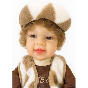 Encante-se com essa adorável boneca bebê realista, perfeita para presentear ou colecionar! Com aproximadamente 40cm de altura, ela possui traços detalhados, cabelo cacheado, olhos expressivos e um sorriso encantador. Vestida com um conjunto de inverno super fofo – macacão marrom com estampa de pato, colete de pelúcia e boina combinando – a boneca ainda acompanha mamadeira e chupeta rosa, tornando a brincadeira ainda mais completa e divertida.