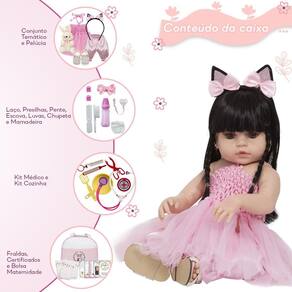 A bebê reborn realista morena bailarina enxoval luxo completo é o sonho das crianças. Produzida 100% em vinil siliconado, essa boneca pode sentar, deitar e fazer tudo que a sua imaginação deixar. Com seus olhos castanhos e detalhes realistas, ela é encantadora e apaixonante. Sua criança merece a melhor qualidade de bebê reborn. A bebê reborn realista morena bailarina possui cabelo cacheado, membros articulados e corpo de silicone. Ela é acompanhada por um enxoval luxo completo, que inclui conjunto de roupa de bailarina, cílios, brincos, chupeta com artesanato, mamadeira luxo, certificados, fraldas, laço de cetim, presilhas, luvas, bolsa maternidade, prendedor de chupeta, kit pente e escova com artesanato, kit médico, kit panelinha e uma pelúcia cor . Tudo para proporcionar uma experiência completa e divertida para sua criança. A altura da boneca é de aproximadamente 46cm e o peso é de cerca de 0,745 kg. Ela possui certificado inmetro e é recomendada para crianças maiores de 03 anos. A marca cegonha reborn dolls é conhecida por sua qualidade e comprometimento em produzir bonecas reborn realistas e duráveis. Com anos de experiência no mercado, a marca é referência no segmento e garante a satisfação de seus clientes. Dúvidas frequentes: