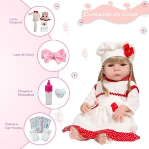 Conteúdo: 1 Bebê Reborn Cabeça, Membros e Corpo de Vinil 1 Conjunto de Roupa Luxo 1 Par de Cílios 1 Par de Brincos 1 Chupeta 1 Mamadeira Simples 5 Certificados 2 Fraldas 1 Laço Cetim
