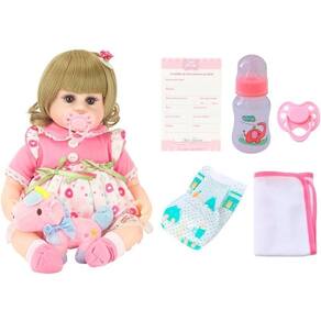 1x Mamadeira; 1x Chupeta; 1x Certidão de Nascimento; 1x Fralda; 1x Roupinha; 1x Ursinho de pelúcia; 1x Par de acessórios para o cabelo; 1x Mantinha.