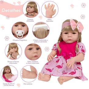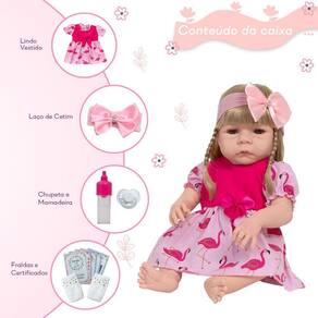 Conteúdo: 1 Bebê Reborn Cabeça, Membros e Corpo de Vinil 1 Vestido 1 Par de Cílios 1 Par de Brincos 1 Chupeta 1 Mamadeira Simples 5 Certificados 2 Fraldas 1 Laço Cetim