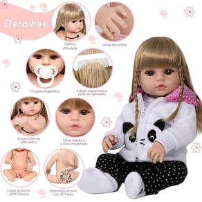 A Boneca Reborn Realista Loira Pandinha Itens Fala 30 Frases é o presente dos sonhos para as meninas que adoram brincar de ser mamãe. Produzida com materiais de alta qualidade, essa boneca é 100% em vinil siliconado, o que a torna extremamente realista e encantadora.