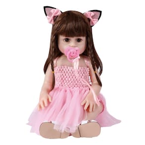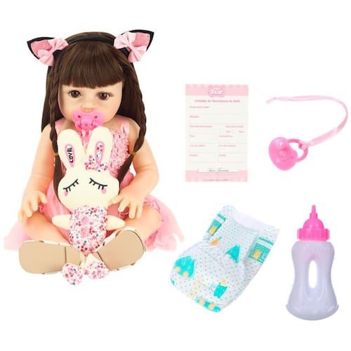 Essa linda boneca realista bebê reborn é o presente perfeito para qualquer criança! Ela tem 48cm de altura, corpo todo revestido em silicone (o que permite banhos), repleto de detalhes marcantes e realistas que vão tornar a brincadeira ainda mais imersiva. Os cabelos da bebê reborn são de fio de nylon suave, macios e de aparência idêntica aos fios humanos, os olhos são de cores vívidas e vão instigar ainda mais a imaginação dos pequenos! A bebê reborn pandinha acompanha mamadeira, chupeta magnética, um conjunto de pijamas e coelho de pelúcia.