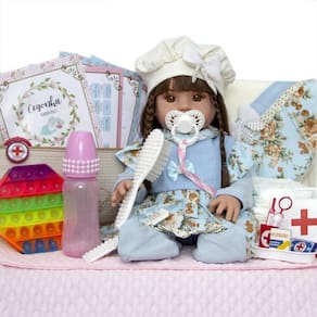 A Boneca Bebê Reborn é a preferida das meninas Produzida 100% em vinil siliconado, essa boneca pode sentar, deitar e fazer tudo que a sua imaginação deixar. Com seus olhos castanhos e cabelos implantados ela é encantadora e apaixonante. Ter um bebê reborn nos braços é uma experiência muito agradável, pois ela oferece grande conforto ao toque e muito realismo com seus traços delicados, a beleza e riqueza de seus detalhes. Sua criança merece a melhor qualidade de bebê rebornConteúdo:- 01 Bebê Reborn Cabeça, Membros e Corpo de Vinil - 01 Conjunto de Roupa Florido Azul- 01 Mamadeira- 01 Escova de Cabelo Decorada- 01 Pente Decorado- 01 Chupeta Magnética- 01 Certidão de Nascimento- 01 Manual de Cuidados- 01 Certidão de Vacinas- 01 Exame do Pézinho- 01 Prendedor de Chupeta- 01 Kit com 3 Fraldas- 01 Kit Médico- 01 Pop it- 01 Bolsa Maternidade- 01 Laço de CabeloMedidas Aprox.:- Altura da Boneca: 52cm- Peso Aprox. Da Boneca: 0,745 Kg- Certificado INMETRO- Recomendado para crianças maiores de 03 anosHomologação Inmetro: 00717/2021-BRINQ-2
