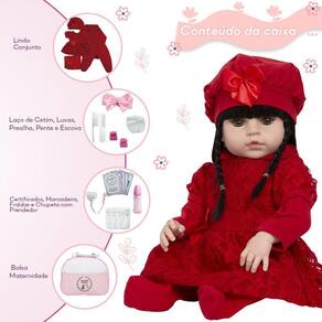 A Boneca Bebê Reborn é o sonho das crianças Produzida 100% em vinil siliconado, essa boneca pode sentar, deitar e fazer tudo que a sua imaginação deixar. Com seus olhos castanhos e detalhes realistas ela é encantadora e apaixonante. Sua criança merece a melhor qualidade de bebê reborn