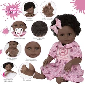 A Boneca Bebê Reborn Negra é o sonho das meninas Produzida 100% em vinil siliconado, essa boneca pode sentar, deitar e fazer tudo que a sua imaginação deixar. Com seus olhos castanhos e detalhes realistas ela é encantadora e apaixonante. Sua criança merece a melhor qualidade de bebê reborn