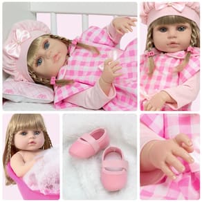 Tags: Boneca Reborn, Menina, Realista, Tipo Barbie, Acessórios, Vinil Siliconado, Membros Articulados, Corpo de Silicone, Detalhes Realistas.