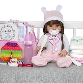 A Boneca Sonho de Amor é a preferida das meninas Produzida 100% em vinil siliconado, essa boneca pode sentar, deitar e fazer tudo que a sua imaginação deixar. Com seus olhos castanhos e cabelos implantados ela é encantadora e apaixonante. Ter um bebê reborn nos braços é uma experiência muito agradável, pois ela oferece grande conforto ao toque e muito realismo com seus traços delicados, a beleza e riqueza de seus detalhes. Sua criança merece a melhor qualidade de bebê rebornConteúdo:- 01 Bebê Reborn Cabeça, Membros e Corpo de Vinil - 01 Conjunto de Roupa Sonho de amor- 01 Mamadeira- 01 Escova de Cabelo Decorada- 01 Pente Decorado- 01 Chupeta Magnética- 01 Certidão de Nascimento- 01 Manual de Cuidados- 01 Certidão de Vacinas- 01 Exame do Pézinho- 01 Prendedor de Chupeta- 01 Kit com 3 Fraldas- 01 Kit Médico- 01 Pop it- 01 Bolsa Maternidade- 01 Laço de CabeloMedidas Aprox.: - Altura da Boneca: 52cm- Peso Aprox. Da Boneca: 0,745 Kg - Recomendado para crianças maiores de 03 anosHomologação Inmetro: 00717/2021-BRINQ-2