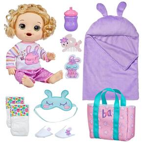 Com a boneca Baby Alive Bunny Sleepover Baby, as crianças podem se divertir com uma festa do pijama imaginária. A boneca de 30 cm vem com diversos acessórios, como um saco de dormir rosa com tema de coelho, uma máscara para os olhos, um coelhinho de pelúcia, chinelos, uma mamadeira, duas fraldas e um pente. Ela é capaz de beber água pela mamadeira e molhar a fralda, o que torna a brincadeira ainda mais realista. O conjunto vem em uma embalagem temática de berço, que é divertida de desembalar e torna o produto um ótimo presente para meninos e meninas de 3 anos ou mais. A boneca apresenta pijamas de 2 peças com tema de coelho, pantufas de coelhinho e uma máscara para os olhos, tudo muito fofo e confortável. A boneca Baby Alive Bunny Sleepover Baby é um playset de figura de brinquedo e é uma marca registrada da Hasbro.