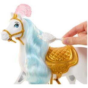 Esta boneca Cinderela e seu nobre cavalo são inspirados nos personagens animados do filme da Disney e estão prontos para uma noite encantada no baile. O cavalo tem uma sela removível e crina e cauda longas para um estilo divertido, enquanto os joelhos da boneca Cinderela se dobram para andar a cavalo pelo reino. Cinderela usa um tecido macio em sua cor azul característica e tem sapatos azuis removíveis.
