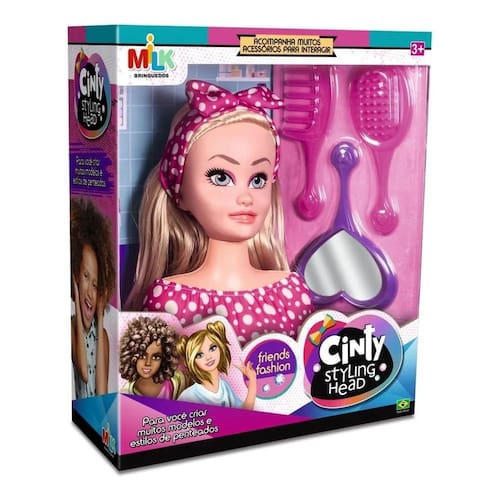 Boneca Cinty Loira Busto Com Cabelo Para Pentear + AcessóriosVenha se divertir com a boneca Cinty Reinvente penteados com a Cinty Styling Head, mais moderna que você já viu Com seus lindos cabelos longos, você pode se divertir com as amigas arrasando com novos looks Benefícios: Estimula a Interação Entre Pais e Filhos, desenvolve a distinção de formas e cores, a comunicação, a coordenação motora, a interação social e cultural...Brincando desenvolve-se a criança num todo Marca: Milk BrinquedosIdade recomendada: A partir de 3 anosCertificação do INMETRO: 001524/2019 - OCP 0006Cor: Pode variar com a imagem apresentada. Imagens meramente ilustrativas.Conteúdo da Embalagem: 01 Boneca, 01 Pente, 01 Escova, 01 Espelho e 10 Xuxinha para cabelo.Material: Vinil.Dimensões Aprox. Do produto (cm) - A: 21 cm (Altura).Dimensões Aprox. Da embalagem - AxLxC: 31 x 13 x 38 cm.Garantia do Fornecedor: 3 meses, sendo defeito de fabricação.Referência do Modelo: 601Código de Barras: 7898283856017