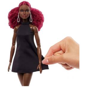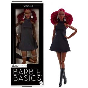Esta boneca colecionável Barbie Basics Model 03 faz parte do relançamento da linha Barbie Basics, que traz o clássico “pretinho básico” em diferentes silhuetas, com foco em versatilidade de guarda-roupa e alta possibilidade de pose. O modelo apresenta pele em tom marrom profundo, cabelo cacheado ruivo preso em meio rabo e vestido preto de gola alta em tecido elástico, acompanhado de botas pretas clássicas.