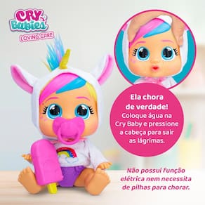 As novas Cry Babies Loving Care sao bebes adoraveis! Permite que as criancas cuidem como se fosse um bebe de verdade. Loving Care Dreamy possui 26cm de tamanho e acompanha novos acessorios como fraldinha, mamadeira e chupeta. Nao possui funcao eletrica e nao necessita de pilhas, chora quando pressiona a sua cabeca!