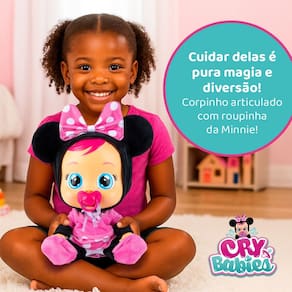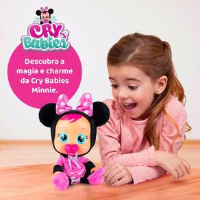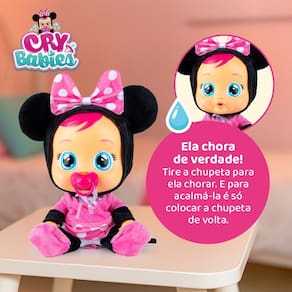 Essa boneca super fofa chora lagrimas de verdade e emite sons iguais ao de um bebe de verdade ! Basta tirar a chupeta da boca dela que ela chora cada vez mais e nao para ate ganha-la de volta. Brincar de boneca ira ficar muito mais divertido com a Cry Babies Minnie!