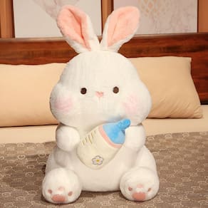 Material: pelúcia Tamanho: 40 cm Peso: 400 g Charming Baby Bunny Design — Apresenta um coelho branco redondo e rechonchudo segurando uma linda mamadeira, com blush rosa suave e orelhas compridas e caídas para um look adorável. Textura macia e confortável — Feito de tecido de pelúcia premium que é suave na pele, proporcionando um toque aconchegante e reconfortante para as crianças. Postura sentada estável — Projetada na posição sentada, facilitando a exibição em camas, sofás ou prateleiras como um toque decorativo e divertido. Durável e seguro para crianças — Feito com costura de alta qualidade e materiais adequados para crianças, garantindo um uso duradouro e brincadeiras sem preocupações. Estilo inspirado em desenhos animados — combina um tema de animais fofos com detalhes divertidos, tornando-o atraente tanto para crianças quanto para colecionadores de pelúcia que amam bonecas macias e fofinhas.