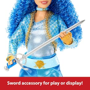 - Essa boneca da Princesa Chloe Charming, Filha da Cinderela, vem com uma espada e está sempre pronta para lutar pelo que é certo!