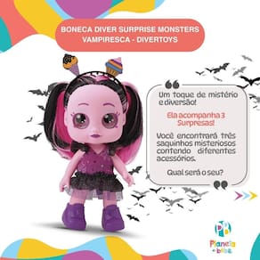 Boneca Diver Surprise Monsters Vampiresca - Divertoys A Vampiresca é uma das personagens encantadoras da linha Diver Surprise Monsters, que combina estilo fashion com um toque de mistério e diversão. Com aproximadamente 26 cm de altura, ela é feita de vinil macio, proporcionando um toque agradável e resistência para brincadeiras diárias. Seu visual único conta com cabelos bicolores em tons de rosa e preto, com tiara decorada, olhos grandes e expressivos, pele rosada e um vestido com saia de tule, criando um look inspirado em vampirinhas modernas. Acessórios surpresa: A cada embalagem, você encontra três saquinhos misteriosos contendo diferentes acessórios, como: Par de sapatos estilizados Botinha ou Galocha , Apliques para colocar na tiara Picolé, Sorvete, Cupcake ou Nuvem e um Chaveiro que pode ser como bolsa para a boneca ou como acessório para a criança Morcego, Abóbora e Coruja . Cada bonequinha guarda mistérios encantadores e um toque de estilo assombroso com suas roupas e acessórios fashion A Vampiresca é perfeita para quem busca uma boneca com estilo único e acessórios que tornam cada momento de brincadeira uma surpresa divertida. Principais Características: - Idade Recomendada: A Partir de 3 anos - Modelo: Vampiresca - Acompanha 3 Saquinhos Surpresa - Cabelo Bicolor Estiloso - Olhos Brilhantes Expressivos - Tiara Estilizável com Apliques - Acompanha Par de Sapatos - Acompanha Chaveiro - Mistério e Diversão - Boneca em Vinil Macio com 26cm - Material Leve e Resistente - Aprovado pelo Inmetro Especificações Técnicas: - Conteúdo da Embalagem: 1 Boneca Diver Surprise Monsters Vampiresca - Divertoys - Dimensões do Produto AxL : 26,5 x 13,0cm aprox. - Composição/Material: Plástico, Vinil - Peso do Produto: 0,750kgs - : 30 dias Contra Defeitos de Fabricação Pelo Fabricante - Certificação: Inmetro 002406/2022 - Código do Fabricante: 8302 - EAN: 7898639383020 - Marca: Divertoys Imagens Meramente Ilustrativas. As cores e estampas podem variar de acordo com o lote do fabricante. Marca: Não Informado