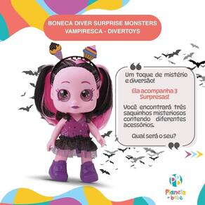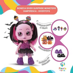 Boneca Diver Surprise Monsters Vampiresca - Divertoys A Vampiresca é uma das personagens encantadoras da linha Diver Surprise Monsters, que combina estilo fashion com um toque de mistério e diversão. Com aproximadamente 26 cm de altura, ela é feita de vinil macio, proporcionando um toque agradável e resistência para brincadeiras diárias. Seu visual único conta com cabelos bicolores em tons de rosa e preto, com tiara decorada, olhos grandes e expressivos, pele rosada e um vestido com saia de tule, criando um look inspirado em vampirinhas modernas. Acessórios surpresa: A cada embalagem, você encontra três saquinhos misteriosos contendo diferentes acessórios, como: Par de sapatos estilizados Botinha ou Galocha , Apliques para colocar na tiara Picolé, Sorvete, Cupcake ou Nuvem e um Chaveiro que pode ser como bolsa para a boneca ou como acessório para a criança Morcego, Abóbora e Coruja . Cada bonequinha guarda mistérios encantadores e um toque de estilo assombroso com suas roupas e acessórios fashion A Vampiresca é perfeita para quem busca uma boneca com estilo único e acessórios que tornam cada momento de brincadeira uma surpresa divertida. Principais Características: - Idade Recomendada: A Partir de 3 anos - Modelo: Vampiresca - Acompanha 3 Saquinhos Surpresa - Cabelo Bicolor Estiloso - Olhos Brilhantes Expressivos - Tiara Estilizável com Apliques - Acompanha Par de Sapatos - Acompanha Chaveiro - Mistério e Diversão - Boneca em Vinil Macio com 26cm - Material Leve e Resistente - Aprovado pelo Inmetro Especificações Técnicas: - Conteúdo da Embalagem: 1 Boneca Diver Surprise Monsters Vampiresca - Divertoys - Dimensões do Produto AxL : 26,5 x 13,0cm aprox. - Composição/Material: Plástico, Vinil - Peso do Produto: 0,750kgs - : 30 dias Contra Defeitos de Fabricação Pelo Fabricante - Certificação: Inmetro 002406/2022 - Código do Fabricante: 8302 - EAN: 7898639383020 - Marca: Divertoys Imagens Meramente Ilustrativas. As cores e estampas podem variar de acordo com o lote do fabricante. Marca: Não Informado Ean: 7898639383020