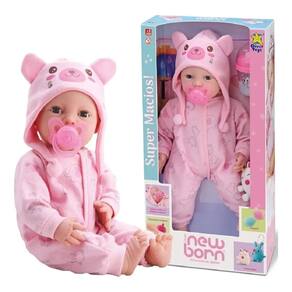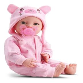 Essa linda bonequinha tem o rosto com fisionomia de um bebê de verdade. O corpo é muito macio e fofinho, produzido com enchimento de vibra. Quando deitada ela fecha os olhos. Ela vem com uma linda touquinha de bichinho e com pompons na ponta, vem com chupeta rosa e mamadeira mágica com desenho de unicórnio, acompanha também um bichinho que pode servir como um brinquedinho para boneca ou então um chaveirinho para a criança.Especificações: Recomendado para crianças acima de 3 anos de idade.Composição / Material: Plástico, Vinil, Tecido e Elástico. Itens Inclusos: • 01 Boneca• 01 Chupeta• 01 Mamadeira mágica• 01 Chaveirinho• 01 Touca de bichinho Embalagem: · Altura: 43 cm· Comprimento: 12 cm· Largura: 23 cm· Peso: 0,740 kg