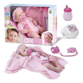 Contém: 1 Boneca New Born Faz Xixi, 1 Mantinha, 1 Mamadeira, 1 Chupetinha, 1 Fraldinha