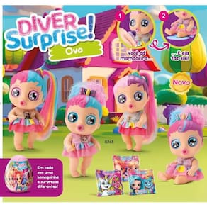 A Boneca Diver Surprise - Ovo Surpresa da Divertoys É Ideal Para Meninas Acima de 3 Anos.A Diversão Ficou Garantida com Essa Bonequinha Misteriosa Que Vem Dentro do Ovo! a Boneca Acompanha 3 Saquinhos com Acessórios Surpresa.Coloque Água Na Mamadeira, Dê Para a Boneca e Ela Faz Xixi. o Ovo Mede Aproximadamente 18cm de Altura.Os Modelos Podem Variar.