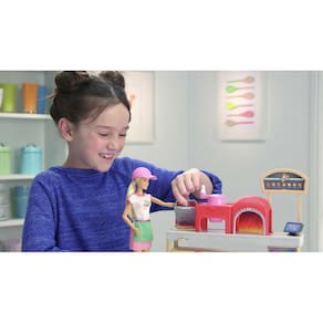 Conjunto de bonecas e brinquedos Barbie Pizza Chef, forno e balcão de brinquedos com correia transportadora deslizante, moldes, 3 cores de massa e acessórios — Divirta-se com um conjunto de brinquedos de pizza que vem com a boneca Barbie, um forno com características criativas de trabalho e todos os ingredientes para fazer, 'assar' e servir pizza, incluindo três cores diferentes de massa! - Use a massa incluída - branca, bege e vermelha - para criar pizza em algumas etapas fáceis: coloque a massa bege e vermelha na prensa de pizza e alise a massa e o molho da pizza; mova-a ao longo da esteira deslizando a alavanca; e mais - Quando estiver 'assada' por tempo suficiente, deslize-a para fora com o controle deslizante de pizza e corte-a com o cortador! - Use a espátula para servir as fatias nos 2 pratos verdes ou envie a torta inteira em uma caixa de pizza! - Receba pedidos e pagamentos na caixa registradora que fica no balcão abaixo do menu. - Guarde os acessórios na prateleira abaixo da esteira ou na minigeladeira abaixo do balcão - a porta abre e fecha! - Conte todos os tipos de histórias com a boneca Barbie vestida de pizzaria com um decalque de pizza na camisa e uma clássica estampa xadrez rosa e branca na saia. Um par de sapatos rosa, um boné rosa e um avental verde completam o look. - Jovens gourmets vão adorar inventar histórias, explorar carreiras culinárias e realizar seus sonhos, porque com a Barbie, você pode ser qualquer coisa!