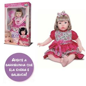 Boneca Baby Kiss Loira 51cm Tipo Reborn Sidnyl 912 Chora e Balbucia A Boneca Baby Kiss é perfeita para encantar qualquer criança. Além de ser uma boneca sofisticada com alto padrão de qualidade, basta você apertar a barriguinha dela para chorar e balbuciar como um bebê de verdade. Baby Kiss estimula a interação entre pais e filhos, coordenação manual, estimula a criatividade e imaginação da criança, para deixar a brincadeira ainda mais divertida. Ela é delicada e compõe um delicioso cheirinho de bebe perfumada. Especificações: - Produto: Boneca Baby Kiss - Marca: Sidnyl - Modelo: Tipo Reborn - Referência: 912 - Medida da boneca em Pé: 51 cm - Instruções: Ao apertar a barriga da boneca, ela chora e balbucia - Funcionamento: 3 baterias AG13/LR44 inclusas - Material: Cabeça, pernas e braços em vinil. Corpo em Tecido TNT com enchimento de algodão atóxico - Certificado de segurança: INMETRO CE-BRI/IQB – 167 NM 300/2002 Conteúdo: - 1 Boneca