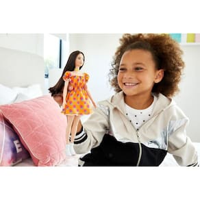 Barbie Boneca Fashionistas #160 com cabelo moreno comprido usando vestido laranja estampado, sapatos brancos e gargantilha amarela, brinquedo para crianças de 3 a 8 anos de idade - A mais recente linha de bonecas Barbie Fashionistas inclui diferentes tipos de corpo e uma mistura de tons de pele, cores de olhos, cores de cabelo, penteados e muitas modas inspiradas nas últimas tendências! - Barbie A boneca é do tipo de corpo autêntico e usa um vestido laranja com estampa colorida. - Sapatos brancos e um colar de gargantilha amarela completam a roupa com toques legais, e seu longo cabelo moreno é estilizado com uma leve onda para um visual moderno. - Projetada com um zíper, a bolsa de vinil reutilizável pode ser usada para guardar a boneca ou outras modas e acessórios da Barbie e as crianças podem personalizá-la com seus próprios materiais de arte, como adesivos. Existem infinitas maneiras de brincar: preencha, carregue e personalize! - É um ótimo presente para crianças de 3 anos ou mais - elas podem brincar com estilo, brincar com histórias e descobrir Barbie! - Mais variedade torna a coleção de bonecas Barbie Fashionistas ainda mais divertida. As crianças podem colecioná-las para expandir as possibilidades (cada uma vendida separadamente, sujeita à disponibilidade).