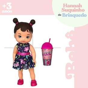 A boneca Hannah suquinho com copo é uma linda boneca feita 100% vinil atóxico. Muito macia e gostosa de abraçar com um vestidinho que é uma fofura, olhos colados e com um cheirinho delicioso. E além disso -Acompanha um lindo Copo com canudo para a criança tomar suco, refrigerante ou água. Desperte a criatividade e a imaginação da sua criança -Recomendada para maiores de 03 anos ESPECIFICAÇÕES: Material: Polietileno, Vinil e Roupa em Tecido Dimensões: Boneca: Alt.: 30cm x Larg.: 11cm Copo: Alt.: 23cm x Diâmetro 9cm Peso: Boneca: Aprox. 260g Copo: Aprox. 51g Registro Inmetro: CE-BRI/IQB 4115 NM 300/2002 Contém: Boneca Hannah Suquinho Com Copo