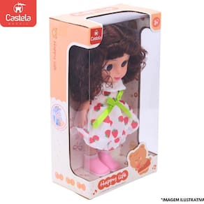 Boneca Happy c/Som Morena Vestido Moranguinho-Castela DESCRIÇÃO DO PRODUTO A Boneca Happy Life Castela é a amiga perfeita para acompanhar as crianças em momentos de afeto e imaginação. Com lindos cabelos castanhos macios e um adorável vestido com estampa de moranguinho, ela conquista pelo visual meigo e cheio de charme. Produzida com vinil e plástico de alta qualidade, essa boneca toca música ao ser ativada, tornando a brincadeira ainda mais divertida. Ideal para presentear, foi feita para ser a melhor amiga da infância e criar lembranças inesquecíveis.