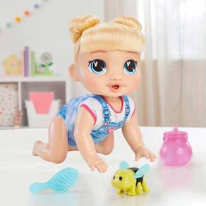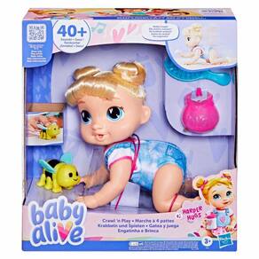 Boneca Interativa - Baby Alive - Engatinha e Brinca - Harper Hugs - Hasbro: Harper Hugs mal pode esperar para brincar. Uma boneca que engatinha de verdade. Basta apertar o botão nas suas costas para ver a boneca engatinhar e emitir sons adoráveis. Esta fofura é uma boneca com acessórios que também incluem uma escova para seu cabelo macio e estiloso. Detalhes: • Ela possui 27 cm e emite mais de 40 sons diferentes, incluindo música divertida. Esta boneca interativa reproduz muitos efeitos sonoros fofos, como ficar animada para engatinhar, comer e rir enquanto anda • Basta dar a mamadeira em sua boca para que a boneca emita sons de comidinha • Amiga abelha que voa: movimente a abelha de brinquedo pelo chão e observe suas asas batendo para cima e para baixo. É muito divertido contar histórias com os acessórios da boneca • Movimenta e dança: Pegue-a boneca no colo e pressione e segure o botão nas costas dela para iniciar uma melodia musical de 12 segundos e fazer seus braços e pernas balançarem como se ela estivesse dançando • Cabelo macio e estiloso: Esta boneca vem com uma escova para pentear os seus cabelos macios e fofos. Ela é uma boneca com cabelo que pode ser escovado e estilizado, além de um macacão removível Informações: • Produto: Boneca Baby Alive Loira Harper Hugs Engatinha e Brinca • Marca: Hasbro • Coleção: Baby Alive • Linha: Baby Alive Engatinha e Brinca • Personagem: Harper Hugs • Tipo: Boneca Bebê Interativa com Acessórios • Categoria: Bonecas e Cia • Tamanho: 27 cm (altura) • Conteúdo: - 01 Boneca Interativa - 01 macacão removível - 01 brinquedo de abelha rolante - 01 copo com canudinho - 01 escova de pentear cabelo • Recomendação: para crianças a partir de 03 anos de idade Especificações: • Modelo: Baby Alive Crawl ‘n Play Harper Hugs • Referência: F9709 • Código de Barras: 5010996271945 • Embalagem (C x A x L): 31 x 35 x 14 cm • Embalagem (Peso): 0.983 kg • Funcionamento: Requer 04 pilhas AA (não incluídas) • Material / Composição: Plástico, Vinil e Tecido • Registro: IFBQ 08845-01/2021 • Certificado: Órgãos Autorizados - OCP´S (Organismos de Certificação de Produtos) Aviso: • As imagens são meramente ilustrativas • Os pesos, tamanhos e medidas são aproximados • As cores e estampas dos produtos podem ter variações • As informações são de responsabilidade do fabricante ou fornecedor
