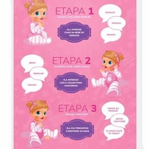Boneca Interativa - Baby Wow - Analu - 150 Frases - Multikids: A Analu adora aprender e brincar. Ela é uma boneca interativa que conversa com você. Analu movimenta a cabeça e a boca enquanto fala. Ensine-a a falar em apenas três etapas de aprendizado e logo ela estará falando mais de 150 frases e palavras. A Analu também conversa com sua família através do celular: basta colocá-lo em sua orelha. Você também pode balançar e fazer cócegas nela!Ela aprende em 3 etapasFase 1 - Ela aprende como um bebê de verdade: vogais e palavras simplesFase 2 - Palavras mais complicadas: interage com o celular para conversarFase 3 - Frases completas: ela faz perguntas e responde as suasDetalhes- Interatividade: conversa com você através do reconhecimento de voz- Aprende a falar: Ensine a Analu a falar em apenas 3 etapas- Vocabulário: Consegue falar mais de 150 frases e palavras- Quanto mais você falar, mais rápido ela vai aprender.Informações:- Produto: Boneca Analu Baby Wow- Marca: Multikids- Coleção: Baby Wow- Tipo: Boneca Interativa- Categoria: Bonecas e Cia- Conteúdo: - 01 boneca- 01 celular de brinquedo - 01 ficha com frases para ensiná-la- Recomendação: para crianças maiores de 03 anos de idadeEspecificações:- Referência: BR732- Código de Barras: 7899838820552- Embalagem (C x A x L): 26 x 35 x 32 cm- Embalagem (Peso): 1.5 kg- Material / Composição: Plástico e componentes eletrônicos- Alimentação: Utiliza 4 pilhas tipo AA (LR6) inclusas- Registro: CE-BRI/BRICS 00706-18 NM 300/2002 | OCP 0098- Certificado: Órgãos Autorizados - OCPS (Organismos de Certificação de Produtos)Benefícios de brincar:- Eleva a autoestima- Exercita a memória- Estimula o raciocínio- Exercita o imaginário- Desenvolve a criatividade- Desenvolve percepção visual- Desperta a atenção e curiosidade- Desenvolvimento neuropsicológico- Estimula habilidades motoras básicas- Incentiva a comunicação e linguagem- Desenvolve aspectos emocionais e afetivo- Estimula o reconhecimento de formas e coresAviso: - As imagens são meramente ilustrativas- Os pesos, tamanhos e medidas são aproximados- As cores e estampas dos produtos podem ter variações- As informações são de responsabilidade do fabricante ou fornecedor