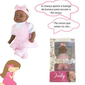 Este é um presente para toda vida, você vai descobrir que a oração pode gerar grande harmonia para toda família, e quando você apertar a barriguinha da boneca, ela vai rezar o Pai Nosso! As meninas vão adorar essa linda boneca! A boneca Judy possui corpinho macio em fibra, as mãozinhas e os pezinhos são com dobrinhas igual a de um bebezinho. As crianças vão adorar!