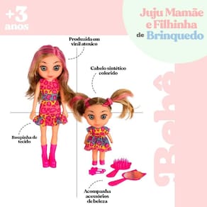 Essa boneca traz todo o encanto e magia para sua brincadeira. Com ela vc vai brincar de Mamãe e Filhinha onde uma é a cara da outra trazendo para a brincadeira mais realismo. além de lindas, possuem lindos acessorios tudo para tornar sua brincadeira mais divertida, a criançada poderá soltar a imaginação e deixar a brincadeira muito mais agradável. -não Recomendável para menores de 03 anos por conter partes pequenas que podem ser engolidas. especificações:material: Polietileno, Vinil e Roupa em TecidoDimensões:Boneca Mamãe: Alt.: 31cm x Larg.: 9cmBoneca Filhinha : Alt.: 18cm x Larg.: 7cm Peso:Boneca Mamãe: Aprox. 121gboneca Filhinha: Aprox. 80g a boneca conta com:01 - Escova de cabelo01 - Espelho02 - presilha de cabelo Contém:Boneca Juju Mommy Mamãe E Filhinha Com Acessórios