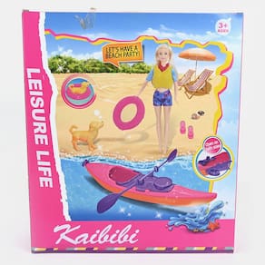 Vá para o ar livre e divirta-se acampando com a boneca Kaibibi. Vista a boneca Kaibibi e seu cachorrinho de estimação em seus coletes salva-vidas e coloque-os no caiaque - há um assento especial para cachorrinhos! As alças no remo facilitam a compreensão da boneca Kaibibi.