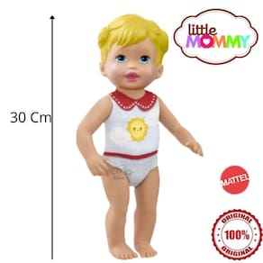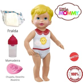 A última linha de bonecas little mommy cuidados inclui 01 boneca, 01 roupa personalizada, 01 fralda, 01 chupeta e 01 mamadeira mágica.