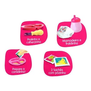 My Little Collection Primeira Papinha Morena - Divertoys A My Little Collection primeira papinha foi desenvolvida para as crianças brincarem de fazer comidinha com o sachê em pó. É só colocar a fraldinha, fazer a mistura da comidinha sachê em pó, dar para a Boneca com a mamadeira e já ela suja a fraldinha. Detalhes do Produto: Conteúdo da Embalagem: 01 Boneca My Little Collection Primeira Papinha, 01 Pratinhos, 01 Colheres, 02 Saches de Comidinha , 01 Fraldinhas e 01 Mamadeira. Tamanho das Bonecas: 32 cm de altura Idade Recomendada: acima do 3 anos Características: Dimensões Embalagem C x L x A : 27 x 10 x 41 cm Referencia: 8105 Material: Vinil Macio Fabricante: Divertoys Certificado INMETRO CE-BRI/INNAC - 00909 - 01A NM 300/2002 Ean: 7898639381057