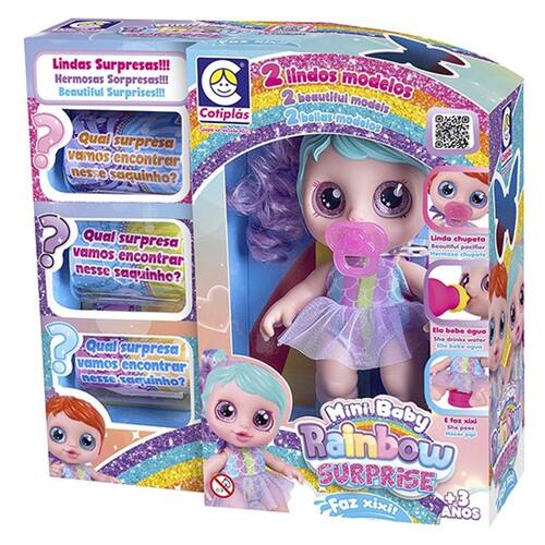Boneca Articulada Surprise Rainbow - Cabelo Com Mechas Lilas Faz Xixi - Cotiplas: a colecao Rainbow Surprise da Cotiplas estimula a curiosidade das criancas descobrindo qual sera a surpresa revelada. O que sera que ela tem de surpresa? Descubra! Venha com a Rainbow para lavar e criar lindos penteados! Informacoes: . Produto: Boneca Rainbow Surprise Cabelo Mechas Lilas Faz Xixi . Marca: Cotiplas . Colecao: Surprise Rainbow . Tipo: Boneca Articulada com Acessorios . Tamanho: 21,5 cm (A) . Conteudo: - 01 Boneca - 03 surpresas . Recomendacao: para criancas a partir de 03 anos de idade Especificacoes: . Referencia: 2720 . Codigo de Barras: 7896964627208 . Embalagem (C x A x L): 27 x 27,5 x 9,5 cm . Embalagem (Peso): 0,562 Kg . Material / Composicao: Vinil . Registro: 000640/2022 . Certificado: Orgaos Autorizados - OCP?S (Organismos de Certificacao de Produtos) Beneficios de brincar: . Eleva a autoestima . Exercita a memoria . Estimula o raciocinio . Exercita o imaginario . Desenvolve a criatividade . Desenvolve percepcao visual . Desperta a atencao e curiosidade . Desenvolvimento neuropsicologico . Estimula habilidades motoras basicas . Incentiva a comunicacao e linguagem . Desenvolve aspectos emocionais e afetivo . Estimula o reconhecimento de formas e cores
