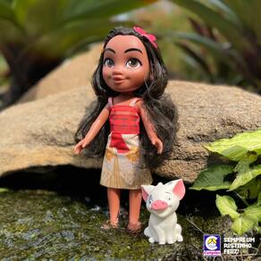 A princesa Moana chegou com seu companheiro inseparável Puá, para brincar com você! Você irá viver várias aventuras ao lado dessa duplinha! Você pode fazer penteados na sua Moana! Seus bracinhos e perninhas são articulados, sua roupinha é toda em tecido, a boneca é toda feita em vinil, e pode molhar!