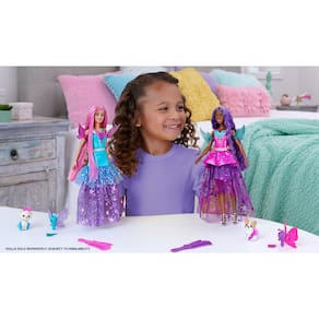 Barbie A Touch of Magic Fashion Doll, Brooklyn com vestido detalhado de asas, cabelo longo colorido de 18 cm, 2 animais de estimação e acessórios de fantasia - Modelada após seu visual brilhante em Barbie Touch of Magic, Barbie boneca "Brooklyn" Roberts vem com um vestido, animais de estimação e acessórios inspirados em contos de fadas. - Esta boneca Barbie dá ao cabelo um toque mágico. Ela tem cabelo roxo de 18 cm de comprimento e inclui acessórios como um pente, faixa de cabeça brilhante e alfinete de cabelo decorativo. - Barbie "Brooklyn" usa um vestido em camadas com detalhes nas asas no decote. Sua longa saia de tule brilha com estrelas, enquanto os punhos brilhantes dão asas e realçam sua roupa mágica. - Seus animais de estimação também são fantásticos. Ela vem com uma adorável amiga borboleta, bem como um cachorrinho de estimação usando um tutu super fofo. - Barbie As bonecas A Touch of Magic são presentes encantadores para crianças a partir de 3 anos. Eles podem colecionar todos para mais aventuras alimentadas pela amizade. Cada um é vendido separadamente, sujeito à disponibilidade.