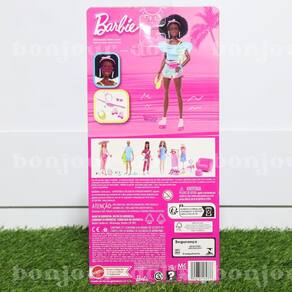 - Barbie A boneca usa uma blusa de babados com ombros de fora com shorts esportivos pastel. Seu cabelo preto encaracolado é utilizado em um lindo afro, e ela tem adoráveis patins rosa nos pés!
