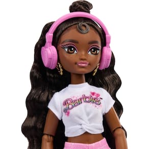 - Barbie “Brooklyn” está perseguindo seus sonhos de ser coreógrafa! Ela vem com acessórios, como fones de ouvido, bolsa de coração, joelheiras em forma de coração, câmera, telefone, capa de telefone em forma de bolsa e casquinha de sorvete!