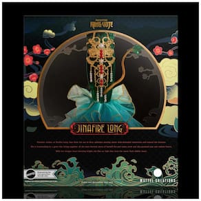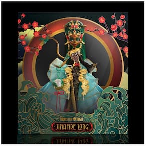 Essa edição especial da Monster High Jinafire Long é resultado de votos e sugestões dos fãs no Fang Club 2024. A boneca mede aproximadamente 28 cm (11 polegadas) e apresenta um vestido longo estilizado com motivos de nuvens e flores vermelhas, além de mangas assimétricas com detalhes em renda preta e dourada.