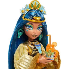 Boneca Monster High Cleo De Nile com roupa glamourosa do Monster Fest e acessórios temáticos do festival, como lanches, pôster de banda, bolsa Statement e muito mais - a boneca Monster High Cleo De Nile ganhou um ingresso para o Monster Fest, o festival de música mais legal do mundo! Com seus acessórios luxuosos e reais, ela mal pode esperar para comer, dançar e ser assustadora! - Esta majestosa múmia está pronta para subir ao palco com uma blusa dourada com franjas e calças em tons de joias. Uma coroa de cobra com flor de lótus adiciona glamour extra ao seu cabelo azul cintilante! - Seja cantando na multidão ou se apresentando com a equipe do boo, sua roupa pronta para o show se destaca com detalhes de luxo, como brincos de escaravelho, bolsa de cinto e óculos de sol coloridos. - Uma das melhores partes de qualquer festival é a comida! Cleo De Nile mal pode esperar para comer um kebab em pirâmide e regá-lo com uma bebida refrescante. - Mais tarde, ela faz uma pose real para a câmera! Acessórios temáticos, como pulseira, pôster de rockstar e muito mais, aumentam as possibilidades de contar histórias em festivais de música.